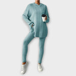 Ovaj komplet od rebrastog trikota idealan je izbor za one koji traže praktičnost s daškom elegancije. Prilagođeni kroj i produžena duljina bluze stvaraju moderan izgled, savršen za nošenje kod kuće, na poslu ili na neformalnim izletima.